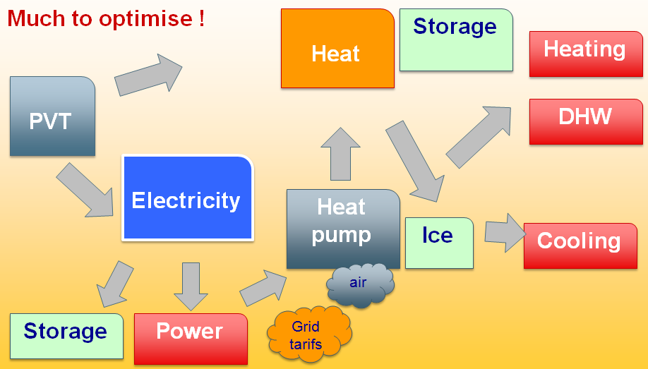 “The key issue is how to design optimised and reliable PVT systems,” explained Jean-Christoph Hadorn, member of the IEA SHC Executive Committee (ExCo) (link to http://www.solarthermalworld.org/content/iea-shc-reaching-40-years-global-research-activities) and manager of Swiss firm Base Consultants. Hadorn, who proposed the new task, created the chart above to illustrate the multiple energy flows between PVT and consumer demand. He intends to focus on systems and their applications, which means no research of components, but simulations to approve the optimised yields of certain configurations.