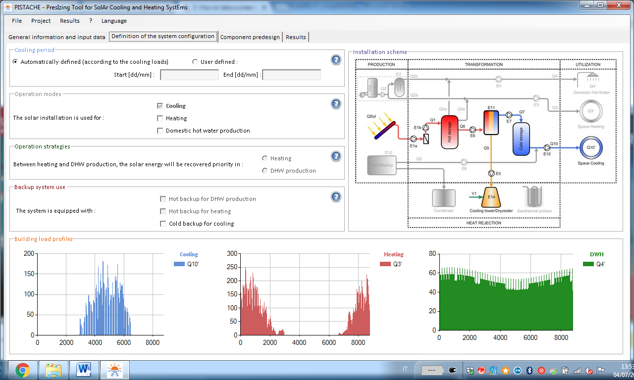 The second tab is called Definition of the system configuration. It is used to select operation modes (cooling, heating and/or domestic hot water production), the cooling period and the backup system for heating and cooling. The backup solution for cooling supply could be either on the cold or hot side. Regarding heat demand, priority can be given to either space heating or domestic hot water production. The tab will then show automatically calculated load profiles and an installation diagram (see figure 1).