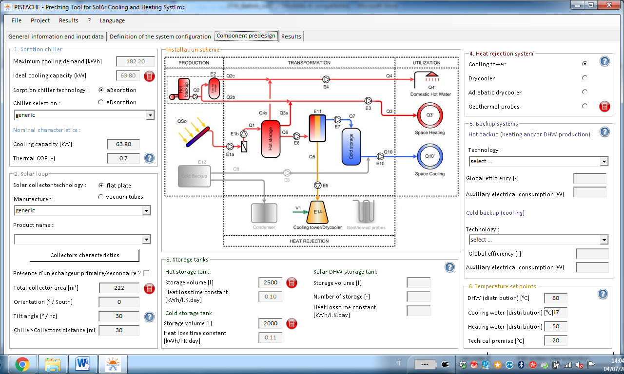 The third tab, Component Predesign, is the one where users will be required to provide detailed technical information on all system components, such as sorption chiller, solar collector an its orientation, storage tanks and heat rejection as well as backup systems (see figure 2). The temperatures for different applications need to be set here as well.