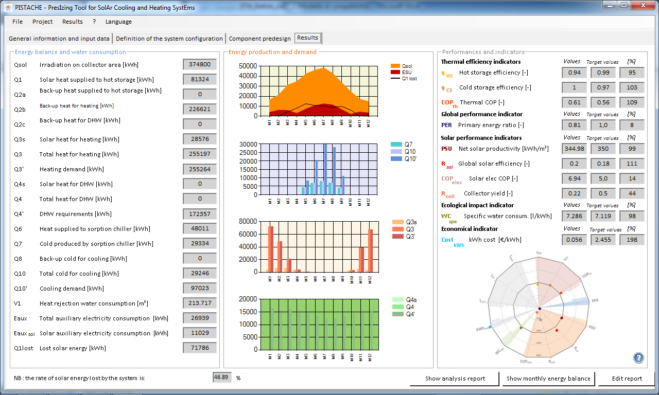 Based on per-hour calculations, PISTACHE will show monthly and annual energy output and estimate yearly performance indicators, grouped into three different categories: thermal efficiency, overall performance and solar performance.