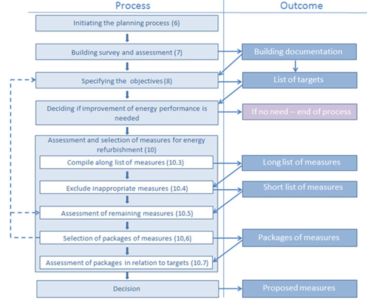 The standard supports decisions on energy-conserving solutions based on thorough knowledge of a building and its value within the built environment. That´s why the standard recommends to analyse the state of the structure and the legal situation surrounding renovations and retrofits before choosing suitable technologies. This initial planning phase is to lead to objectives for improving energy performance while considering system economics, the impact on the heritage value, the legal framework and indoor climate conditions (see first four items in the chart below).
