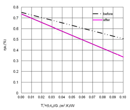 Performance coefficients before and after testing. Eta0 represents the starting point of the efficiency curve on the y-axis, while a1 is the initial heat loss coefficient.
