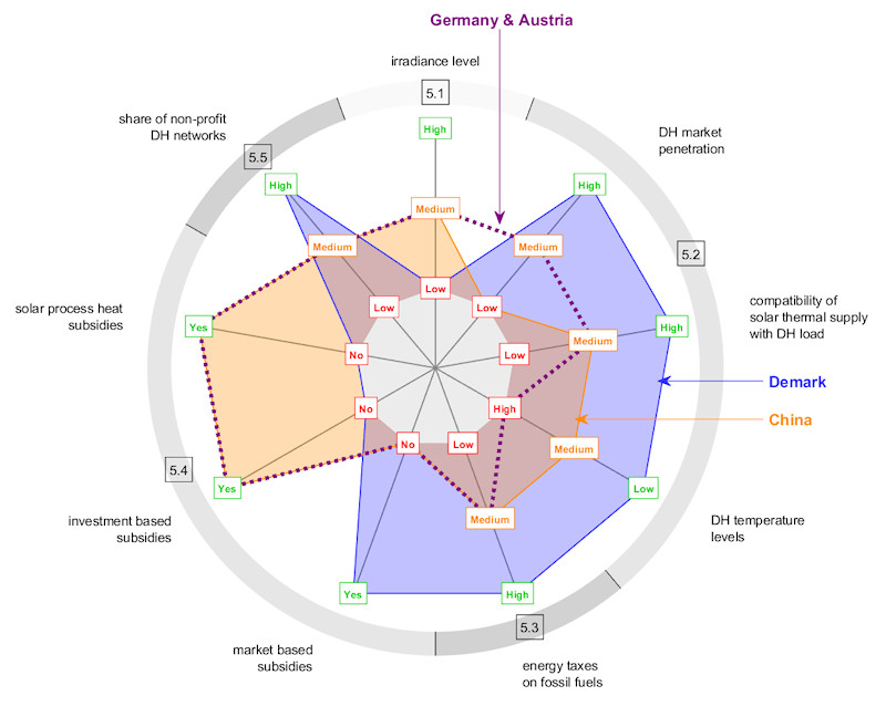 Throughout the main part of the paper, its authors analyse what country-specific factors contributed to the deployment of large solar thermal systems in each of the four countries, grouping them into 5 categories. These categories were again divided into sub-categories (in brackets):