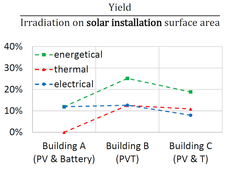 PVT has the highest output when adding together thermal and electrical yields across the roof area covered by solar systems. Chart: Task 60 - SPF