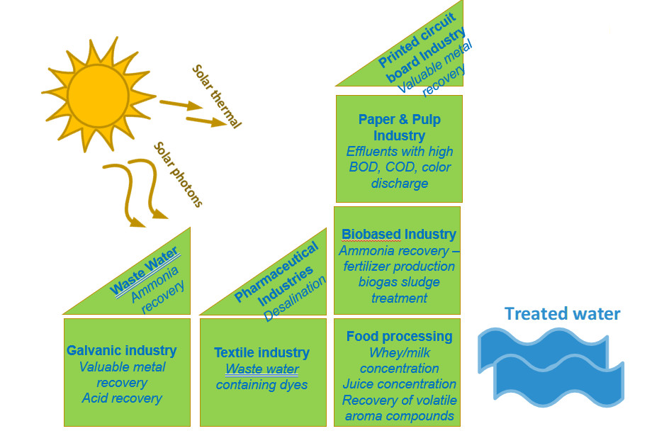 We see solar energy as a reliable ally in reducing energy and water demand from many industrial applications. We are following two very different approaches to meet our objectives. Typically, we use the solar heat generated by collectors to clean water via membrane distillation, vacuum evaporation or pervaporation. Some task colleagues also use solar photons directly to purify water by way of photocatalysis, decontamination or disinfection.