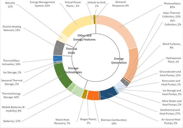 The individual projects differ in terms of energy generation, storage and distribution as well as their heating needs (HDD - Heating Degree Days) depending on their location (see figure 1). The examined buildings showcase all variants of solar technologies. "82 % of all buildings use PV, 53 % solar thermal, and PVT collectors are used in 2 % of the projects", explained Ramschak, regarding the technology portfolio (see figure 2). Furthermore, different storage technologies are found in the selected SEBs: batteries (17 %), mobile batteries (e-mobility) (8 %), thermal storage (44 %), ice storage (2 %) and thermal mass activation (10 %). A total of 23 % of the SEBs are connected to a district heating network.