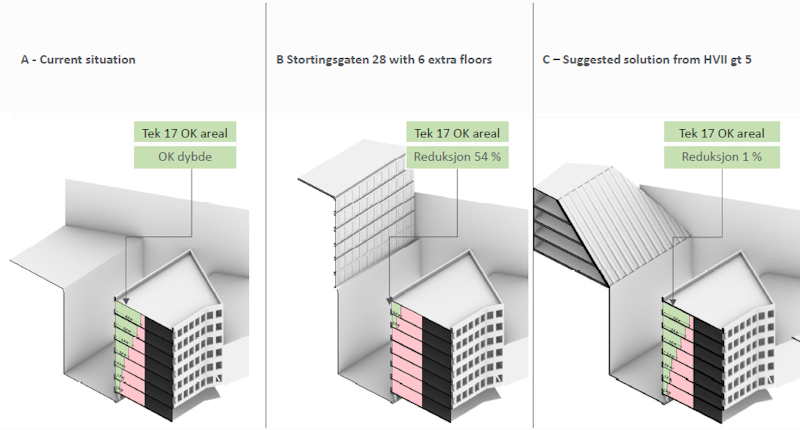 Her story started in 2016 when a building owner wanted to raise their building by six floors with significant impact on a neighbouring house as you can see in the graphic above. The planning department of the city turned down the planning application. “The politicians, on the other hand, said they wanted this project to be realised because it increased the building density in the city and that is environmentally correct”, said Bryn. But the owner of the affected building took legal assistance and asked Multiconsult for technical support.