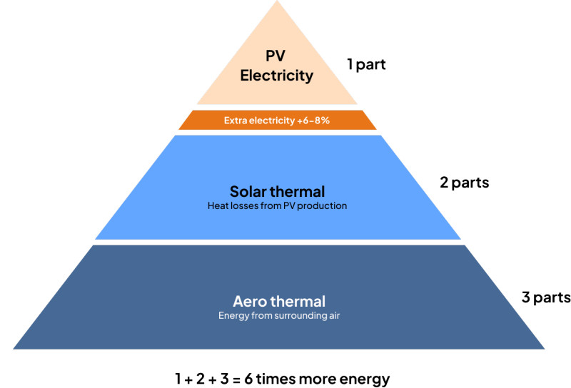 Dualsun is another PVT manufacturer that is heavily involved in Task 73. Marcus Kanewoff, CEO from Dualsun Nordic, represented the French PVT producer during the online conference. He presented a compelling visual – a pyramid – demonstrating how PVT panels can harness up to six times more energy from a rooftop compared to conventional PV panels alone. The dark blue part of the pyramid stands for the energy from the surrounding air that can be used via the large heat exchanger surface at the back of many PVT elements.