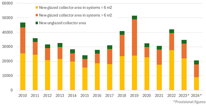 Figure 1: Market development for residential solar thermal systems between 2010 and 2024. PVT collectors and large solar district heating systems are not included in these statistics.