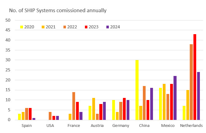 Abb. 2: Top markets in terms of the number of new SHIP plants commissioned per year between 2020 and 2024.