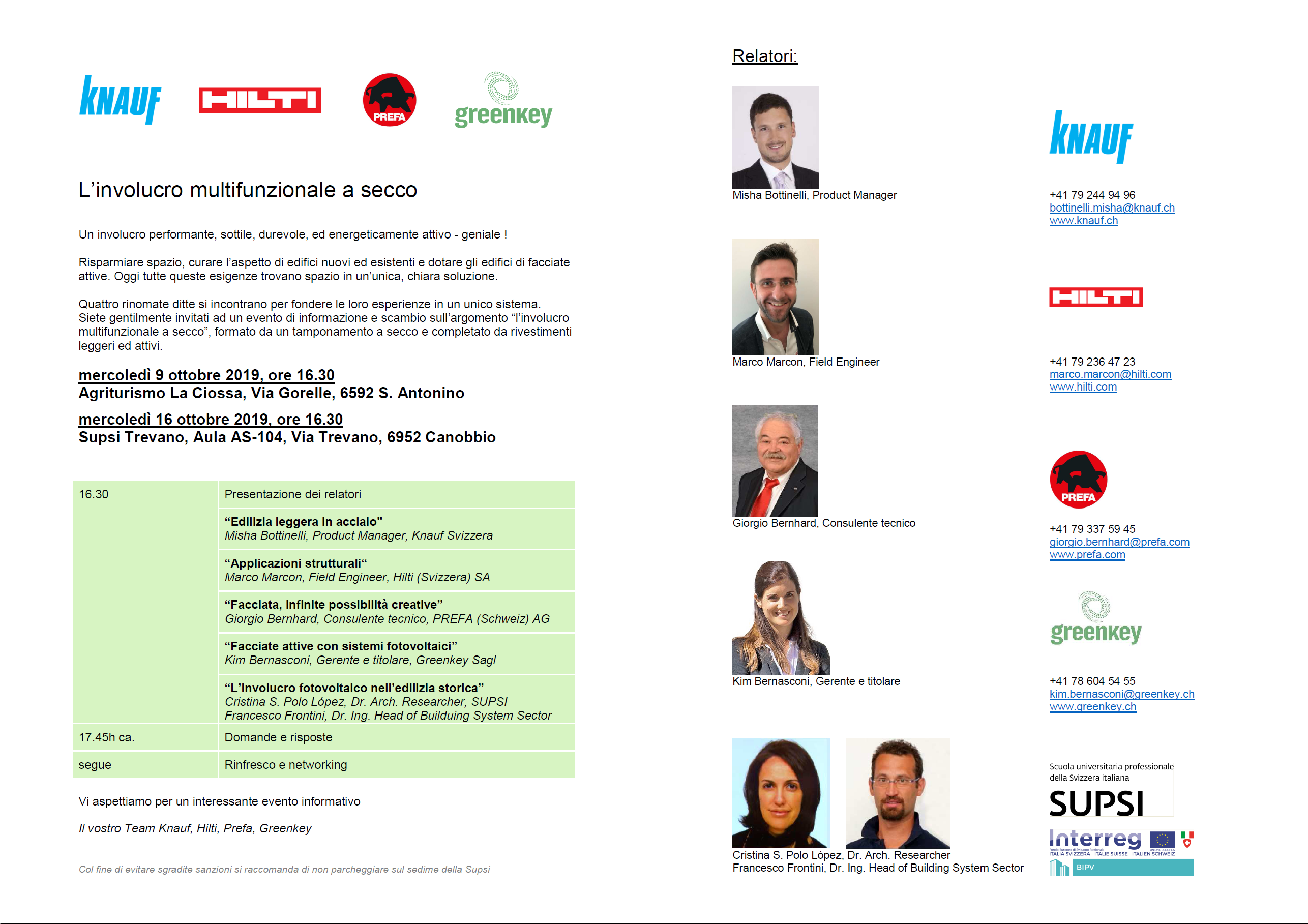 Two parallel of information and exchange events between companies in the construction and photovoltaic sector on the subject of multifunctional building envelope, with light and active coatings will be organized in Ticino. Renowned companies in the construction sector meet professionals to illustrate the potential of the dry, high-performance, thin, durable and energetically active envelopes, in saving space, taking care of the appearance of new and existing buildings and equipping buildings with elements of active casing to produce clean energy. The companies Knauf, Hilti, Prefa and Greenkey meet the professionals and the University of Italian Switzerland SUPSI, presents how the active envelope and solutions of solar architecture can make even landscape-protected buildings self-sufficient and there will talk of solar architecture, of BiVP (photovoltaic systems integrated into buildings) as a reference construction model, of solar integration in historic buildings. Approximately 40 architects / Engineers are expected per evening, with renowned reference professionals at local and national level. Following the event there will have an “Aperitif Dinner" to encourage networking between companies and professionals. The events, aimed at professionals and companies, were used as exchange and investigation events for specific target groups and to gather input useful for mapping the stakeholders in the territory.