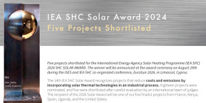 07 AUG 2024 Solar Award 2024: Five Projects Short listed Five projects shortlisted for the International Energy Agency Solar Heating Programme (IEA SHC) 2024 SHC SOLAR AWARD. The winner will be announced at the... read more